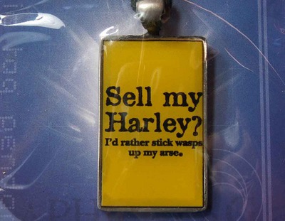 Pendant text : sell my harley? rd rather stick waspe up my arse Height, 35mm, Width, 20mm, Graphic tag incl. zwarte veter verstelbaal op gewenste lengte