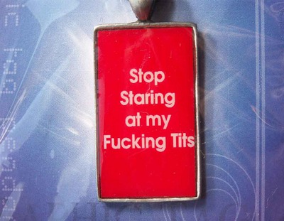 Pendant text : Stop Staring at my Fucking Tits Height, 35mm, Width, 20mm, Graphic tag incl. zwarte veter verstelbaal op gewenste lengte