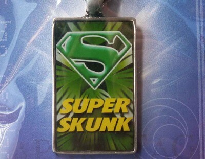 Pendant text : Super skunk Height, 35mm, Width, 20mm, Graphic tag incl. zwarte veter verstelbaal op gewenste lengte