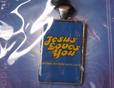Pendant text : jesus love you,everybody elde think you’re prick Height, 35mm, Width, 20mm, Graphic tag incl. zwarte veter verstelbaal op gewenste lengte