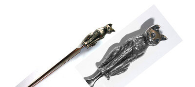 st justin, Materiaal : Tin (pewter), Breedte, 20mm, lengte 50mm, (inc mes.): 175 mm Kat briefopener geleverd in een luxe geschenkdoosje