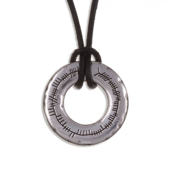 The Ogham alphabet was, according to the legend created by the Celtic god Ogmios. God of wisdom. Ogham characters are only found in the British Isles. A central stem from which short vertical bars to the left or right was crossed. Most inscriptions were magical, This pendant means Ring of love, bind us together.
