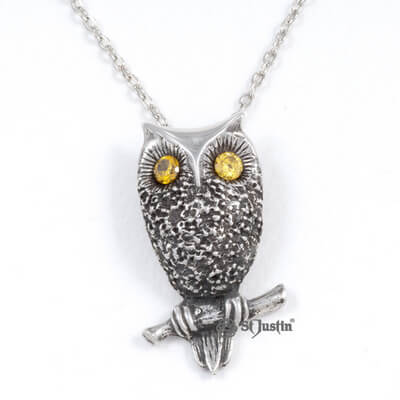 Owl pendant with gold crystal eyes come in a St.Justin gift box.