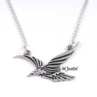 Merk : st justin, Materiaal : Tin (pewter), Hoogte, 23mm Breedte, 40mm, lengte ketting, 45 cm Hanger geleverd in een luxe sieradendoos