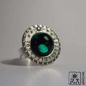 Saturn Ring The ring is adaptable Materials: Metal and Crystal color Emerals , Dimensions: 24 x 24 x 28 mm Finish: Silver-plated Presentation: In an individual box with operating instructions in Spanish, English, French and German. How it works: Expose the ring to the sun and southwards moving it until we see a ray of light on the timebase. The lighted number will indicate the solar time.