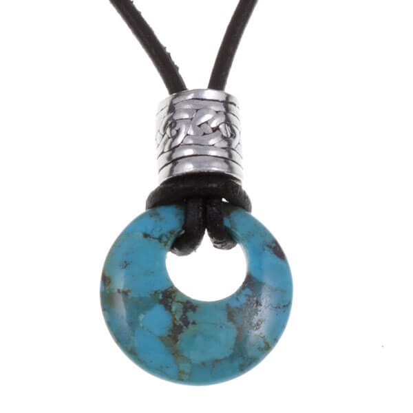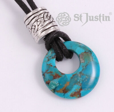 Turquoise Gem Circlet with black leather thong. Strength and Success – The vibrant blue stone is considered sacred by many cultures. It gives courage, fulfilment and success. It also represents strength and power and is a good conductor for healing.. Height, 20mm, Width, 20mm, Turquoise amulet incl.black string rejustable on every size. Come in a St.Justin gift box.
